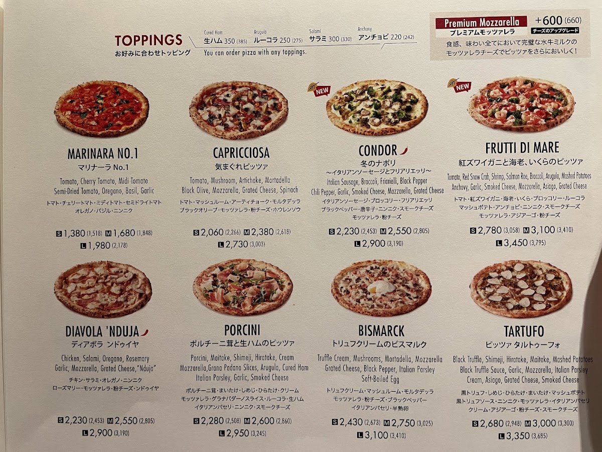Sサイズ(23cm)/Mサイズ(27cm)/Lサイズ(30cm)・生ハム 385円 ・ルーコラ 275円 ・サラミ 330円 ・アンチョビ 242円・プレミアムモッツァレラ チーズのアップグレード+660円
